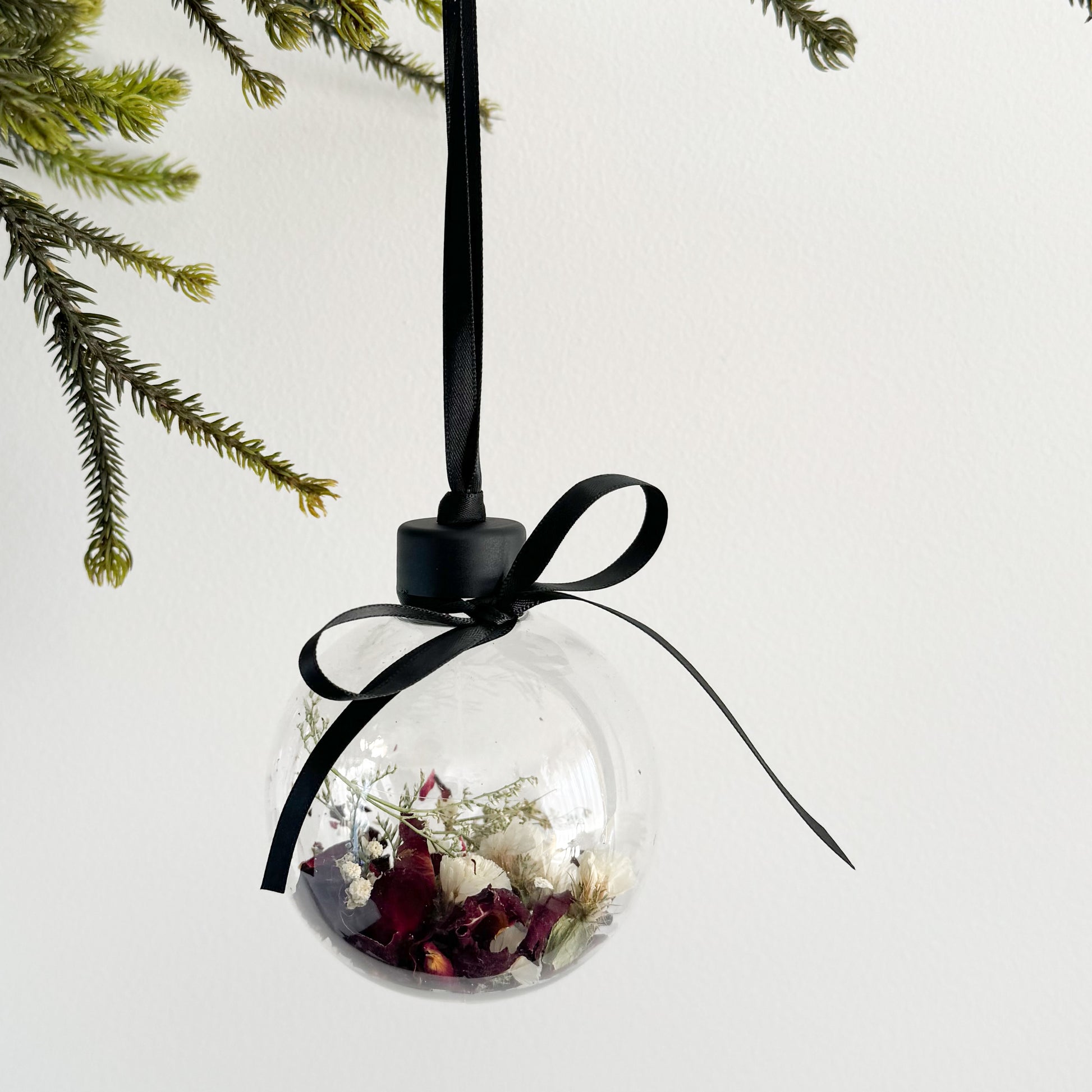 Materials: Shatterproof bauble - plastic, natural and artificial floral, feathers, ribbon